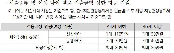 - 지원시술:체외수정(신선배아, 동결배아), 인공수정 시술비 중 일부 및 전액본인 부담금, 비급여 3종(배아동결비, 유산방지제 및 착상보조제)