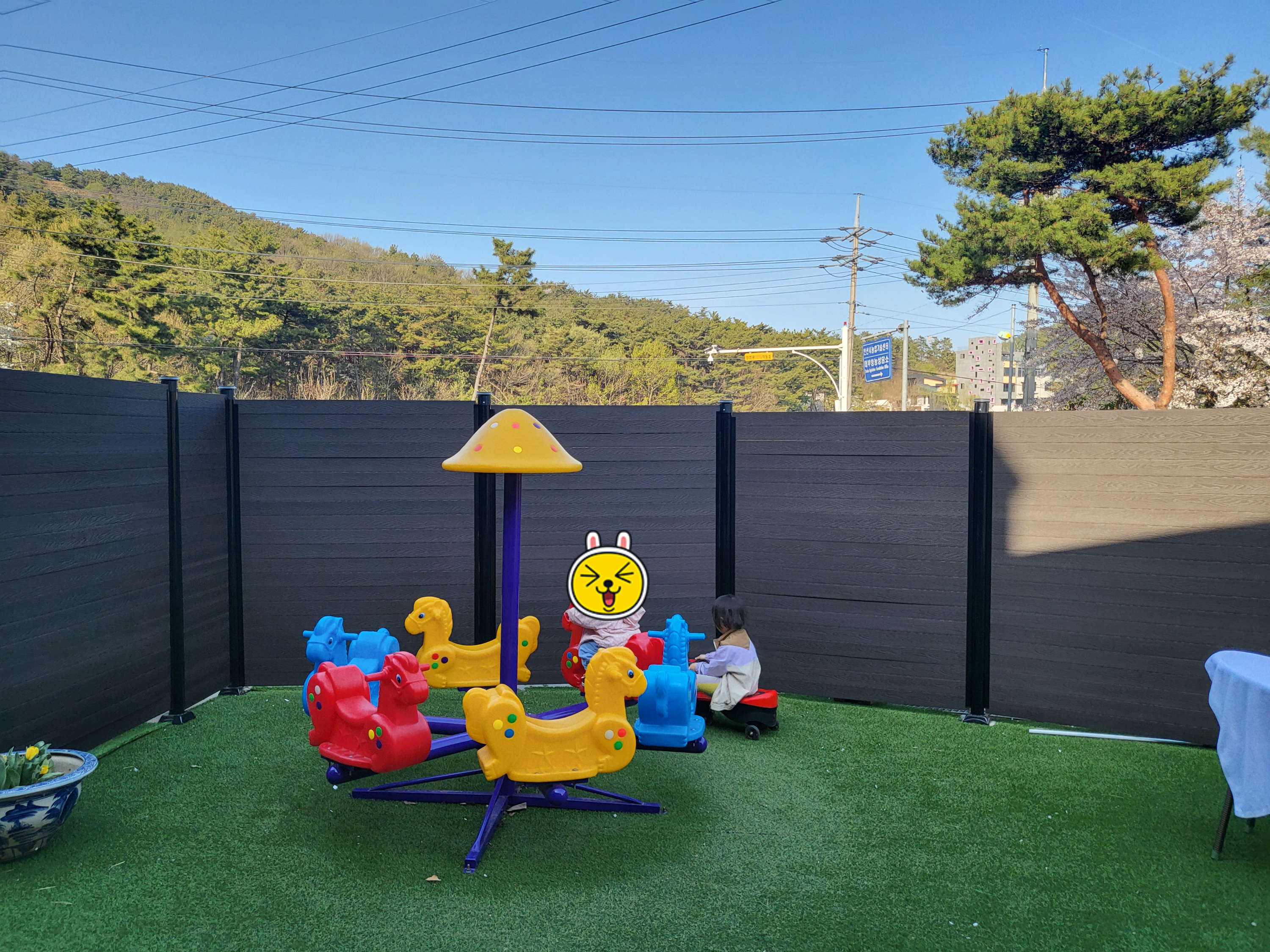 주차하고 들어가자마자 독채 잔디마당에 아이들이 놀 수 있는 공간이 있습니다.