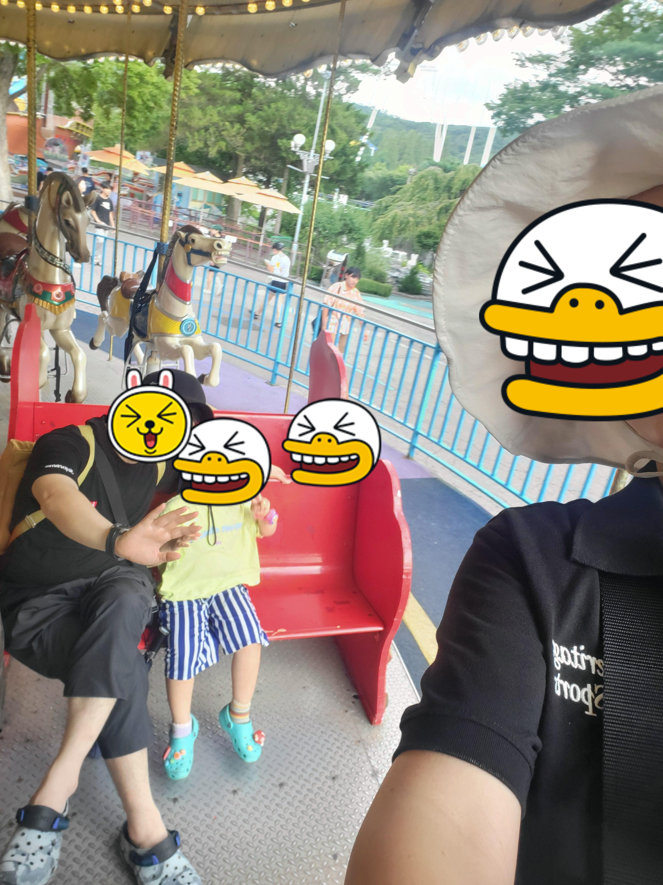 역시 회전목마는 가족 놀이기구 입니다. 어린아이와 같이 오면 필수로 타야하는 코스죠. 저희 아이도 처음엔 말에 혼자 무서워서 못타겠다더니 두번째부터는 말에 혼자 타더라고요. 회전목마도 대기없이 또 바로바로 탈 수 있었어요.