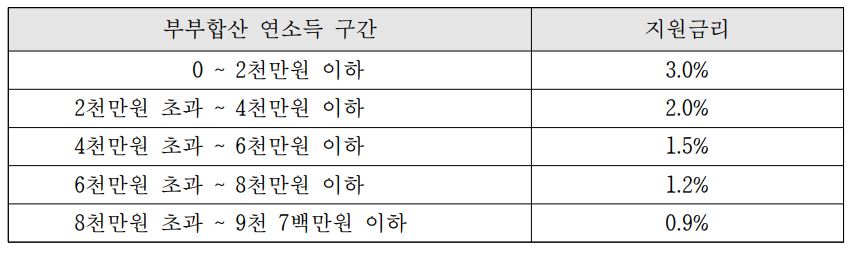 - 연소득에 따른 이자지원금리: 소득에 따라 이자지원금리가 다르니 아래 참고하시기 바랍니다.
