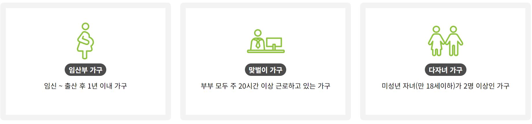 - 지원대상 : 서울거주 중위소득 150%이하 임산부·맞벌이·다자녀 가정