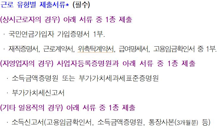 - 직장가입자 아닌 경우 근로유형별 제출서류 제출 필요