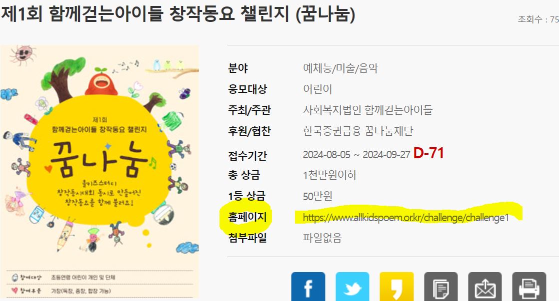 저는 아이가 유치원생이라 유치원생도 참여할 수 있는 공모전이 있나 찾아보다가 괜찮은 공모전 주제가 있어서 하나 예시로 가져왔어요. 유치원, 초등학생이 대상이고요. 디지털관련 폼이 아니고 도화지에 그림을 그려서 내는 거라 비교적 어린아이들이 참여하기에도 좋을 것 같습니다. 상금도 무려 1등은 100만원 이네요! 저희 아이는 아직 동그라미 밖에는 못그리는 관계로 참여는 못하겠지만 관심있는 분들은 신청하시기 바랍니다.