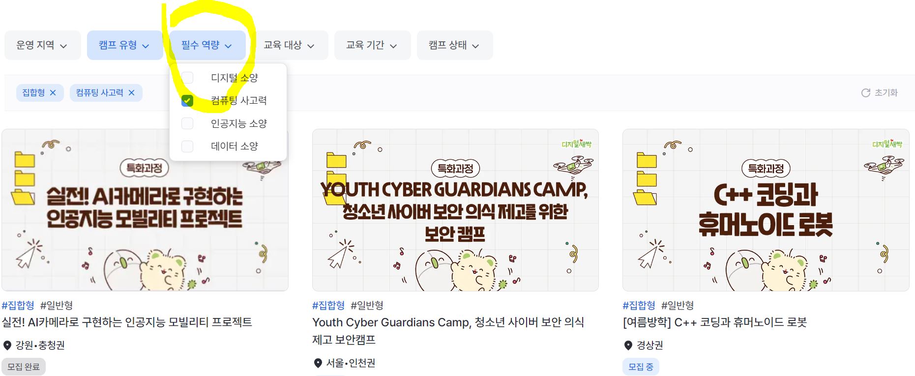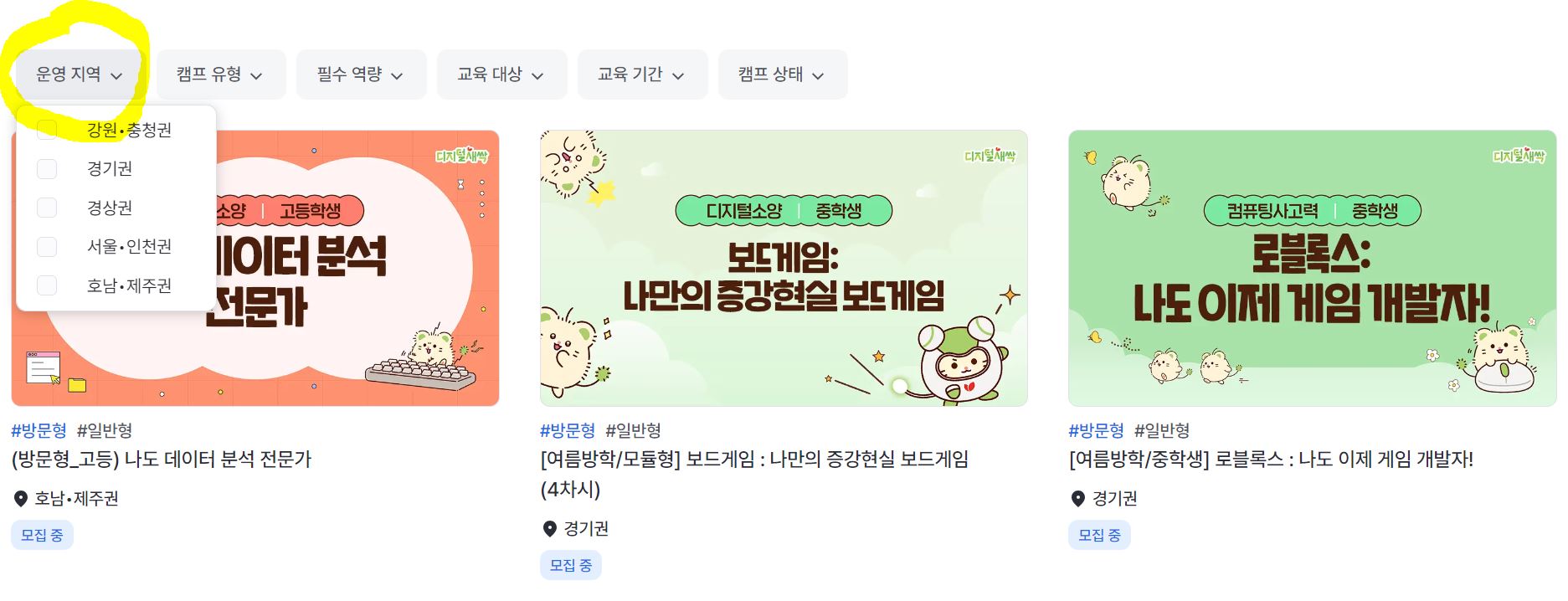디지털새싹 캠프 홈페이지에 들어가면 지금 모집중인 캠프를 신청할 수 있어요. 운영 지역별로, 캠프유형별, 필수역량별, 교육대상별, 교육기간별, 캠프상태별로 선택 후 원하는 캠프를 선택할 수 있습니다. 어떤 캠프들이 있는지 한 번 먼저 훑어 보시려면 캠프상태와 운영지역별로만 먼저 체크 후 보시는 것을 추천 드려요.