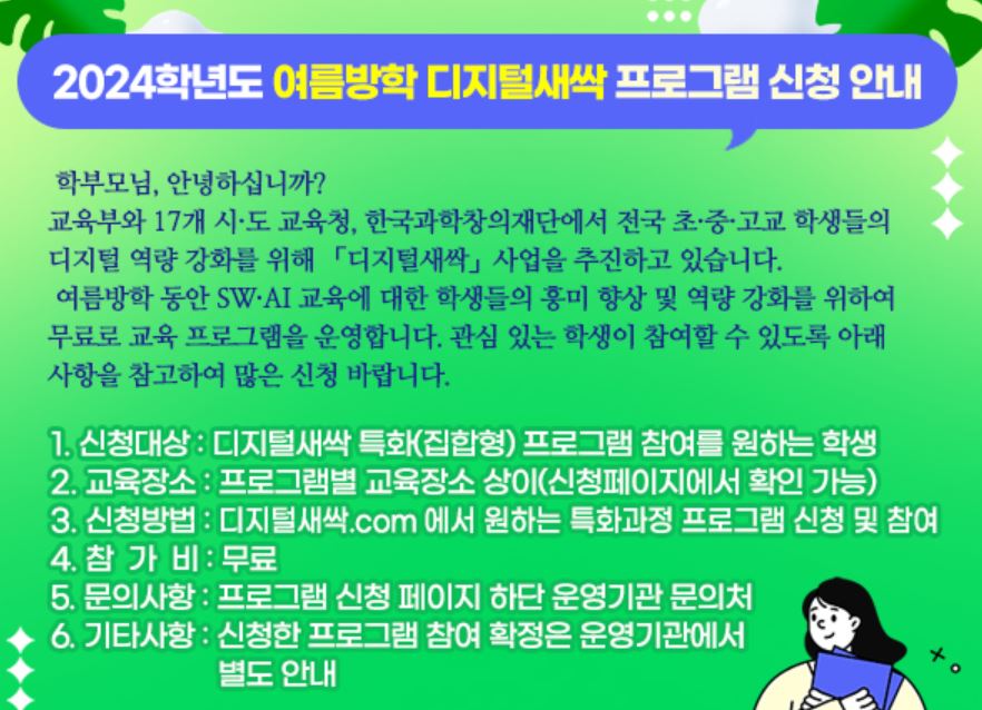 여름방학 동안 우리 집에서 게임만 하지 말고 디지털새싹캠프 무료로 참여하고 재미있게 디지털 소양도 쌓고 새로운 친구들도 만나는 즐거운 시간 보내셨으면 좋겠습니다.