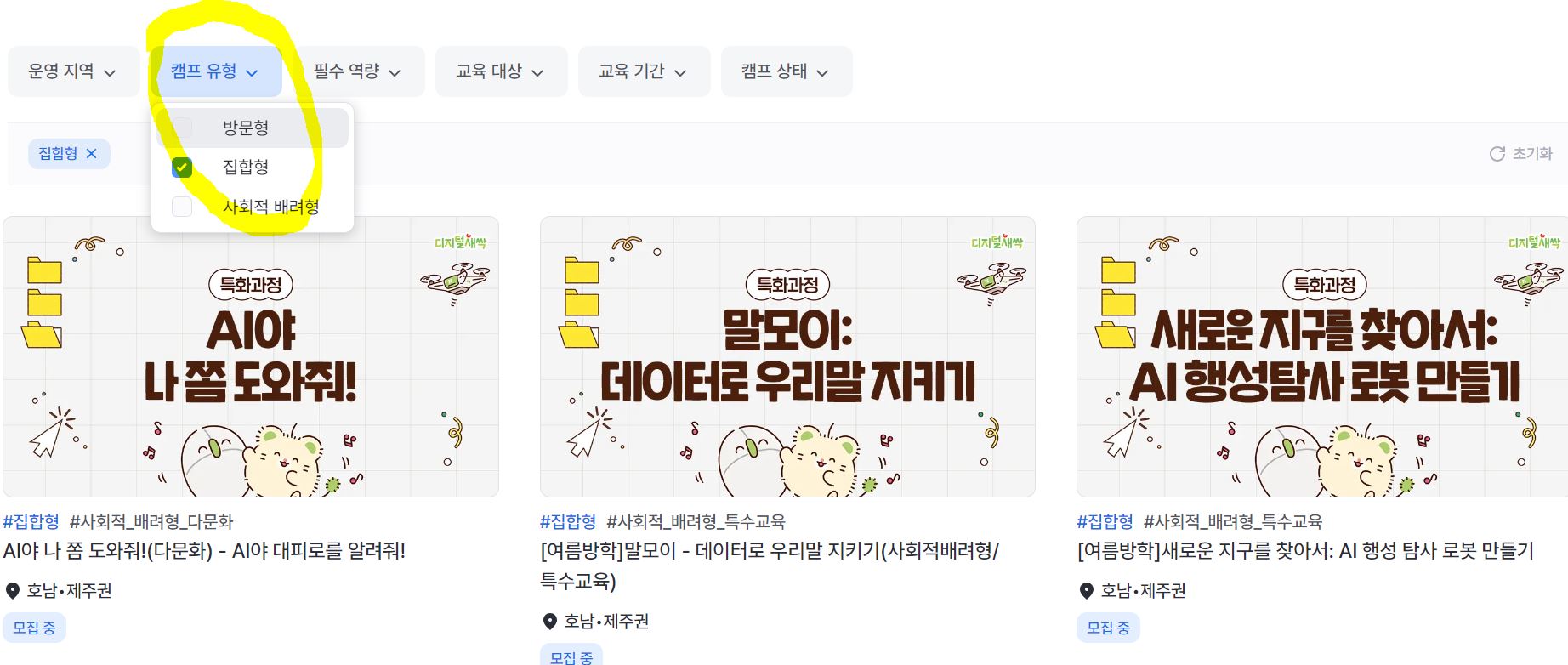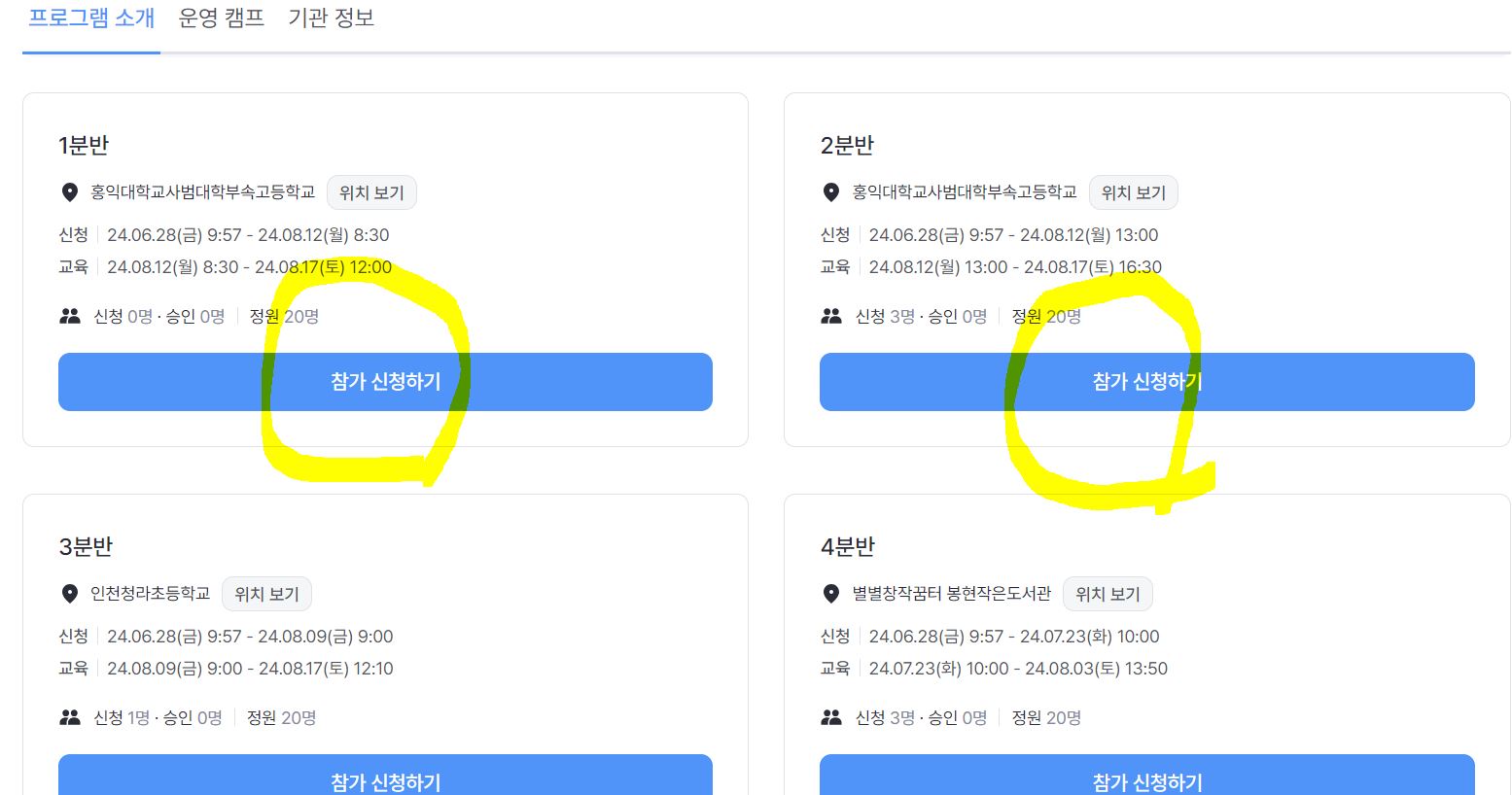 집합형은 학생 혹은 학부모가 직접 신청하고, 방문형은 학교에서 방과 후 활동 등으로 신청을 하는 것이더라고요. 그래서 방문형은 학교 자체에서 신청 후 교내 학생들에게 신청을 받는 것 같습니다. 그래서 지금 직접 원하는 캠프를 참가 신청 하시기 위해서는 집합형으로 보시면 되요.