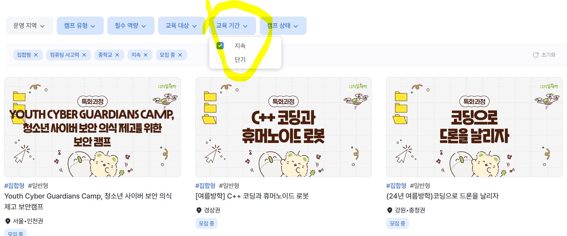 디지털새싹 캠프 홈페이지에 들어가면 지금 모집중인 캠프를 신청할 수 있어요. 운영 지역별로, 캠프유형별, 필수역량별, 교육대상별, 교육기간별, 캠프상태별로 선택 후 원하는 캠프를 선택할 수 있습니다. 어떤 캠프들이 있는지 한 번 먼저 훑어 보시려면 캠프상태와 운영지역별로만 먼저 체크 후 보시는 것을 추천 드려요.