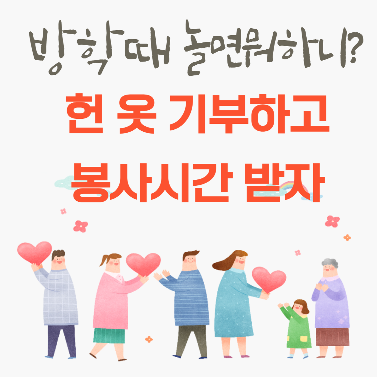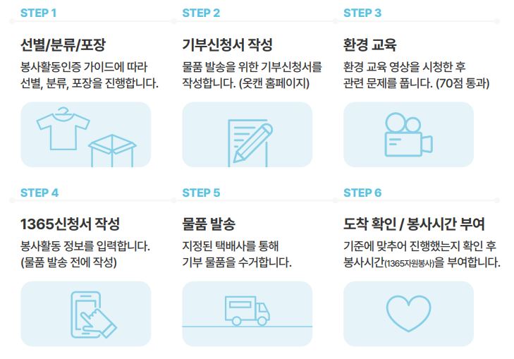 - 단순 기부가 아닌 옷의 선별/분류/포장 활동에 대해서 봉사활동으로 인정됩니다.