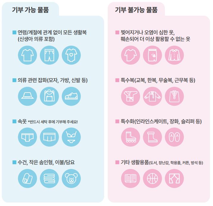 아래 기부 가능 품목을 참고 후 가능한 물품만 선별합니다. 이때 너무 낡거나 오염이 심한 것은 피하고 작은 얼룩 등은 세탁 해서 선별해 주는 게 좋습니다.