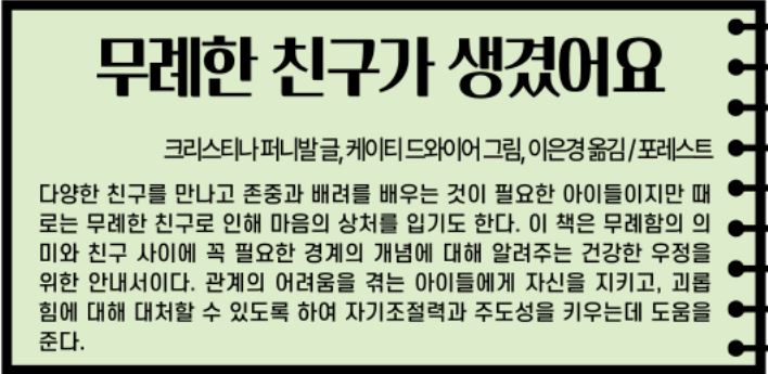 오늘은 방학기간 동안 읽으면 좋은 추천 도서 목록을 살펴보았는데요, 사실 어린이집, 유치원 다니는 친구들은 방학이 길지 않아서 방학동안 저 목록을 다 읽진 못하겠지만 여름방학 동안만 읽으면 좋은게 아니고 유아들에게 좋은 내용을 담은 도서들이니 시기에 상관없이 참고하시면 좋을 것 같습니다. 조만간 초등학생 방학 추천도서 목록도 담아올게요.