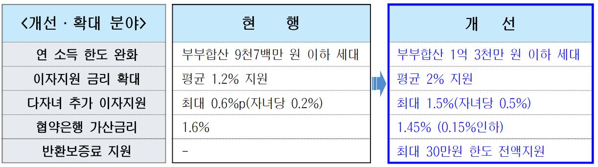 개선된 사항은 아래와 같아요. 연소득 한도 완화, 이자지원 금리 확대, 다자녀 추가 이자지원, 협약은행 가산금리 인하, 반환보증료 지원이 있습니다. 변경 사항은 7월 30일 이후 부터 적용 됩니다.