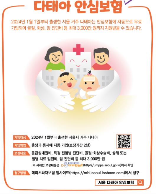 이렇게 한명도 보험료가 부담스러운데 쌍둥이 임신 하신 분들은 훨씬 부담이 되실텐데요. 다행히 서울시에서 2년동안 쌍둥이 이상 다태아 아동에게 보험을 무료 가입 지원해준다니 반가운 소식이 아닐 수 없습니다.