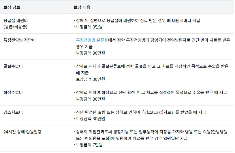 필수 보장항목 (응급실, 특정 감염병, 골절, 화상, 깁스)외 12가지 추가 항목을 보장합니다.