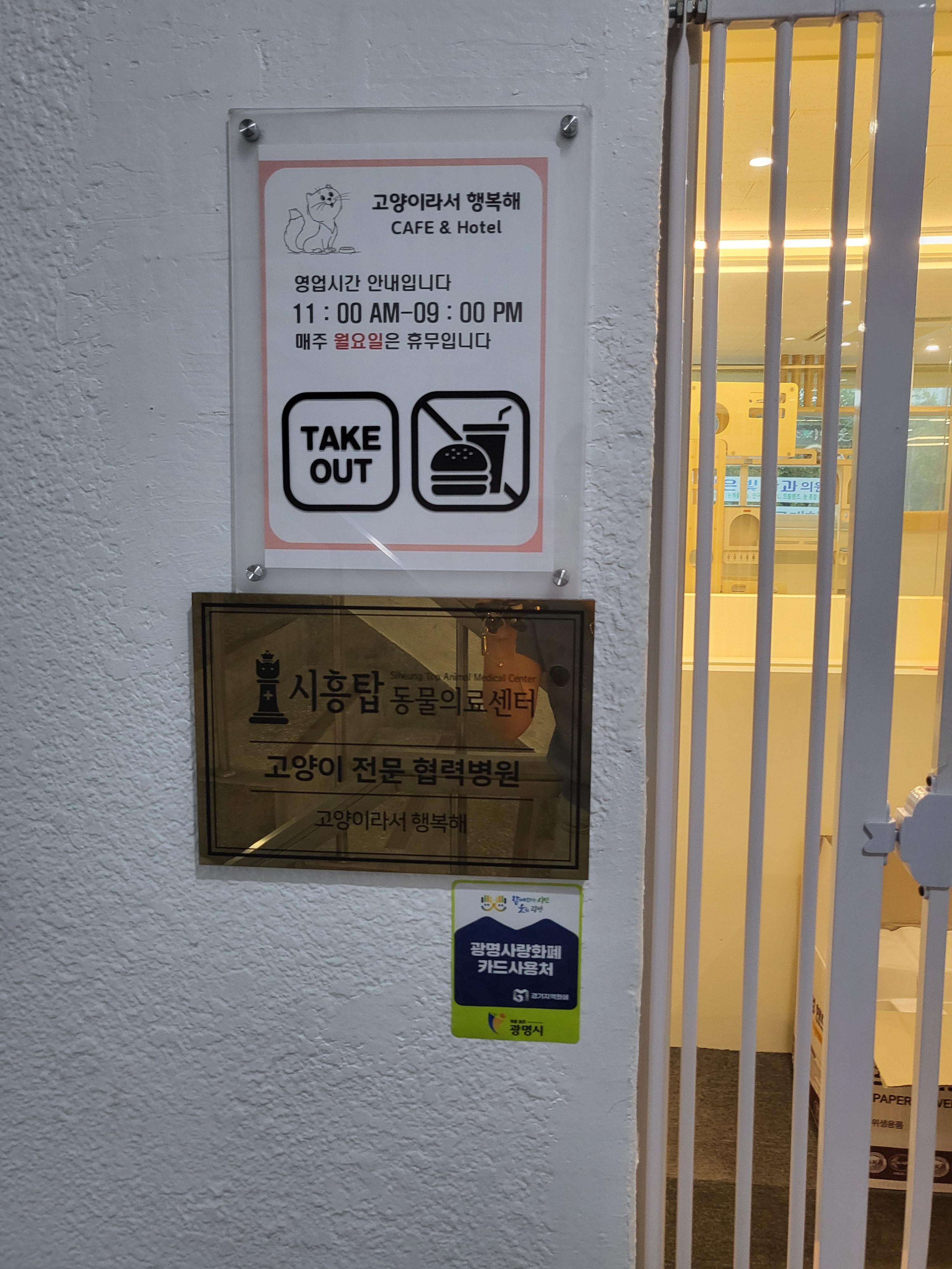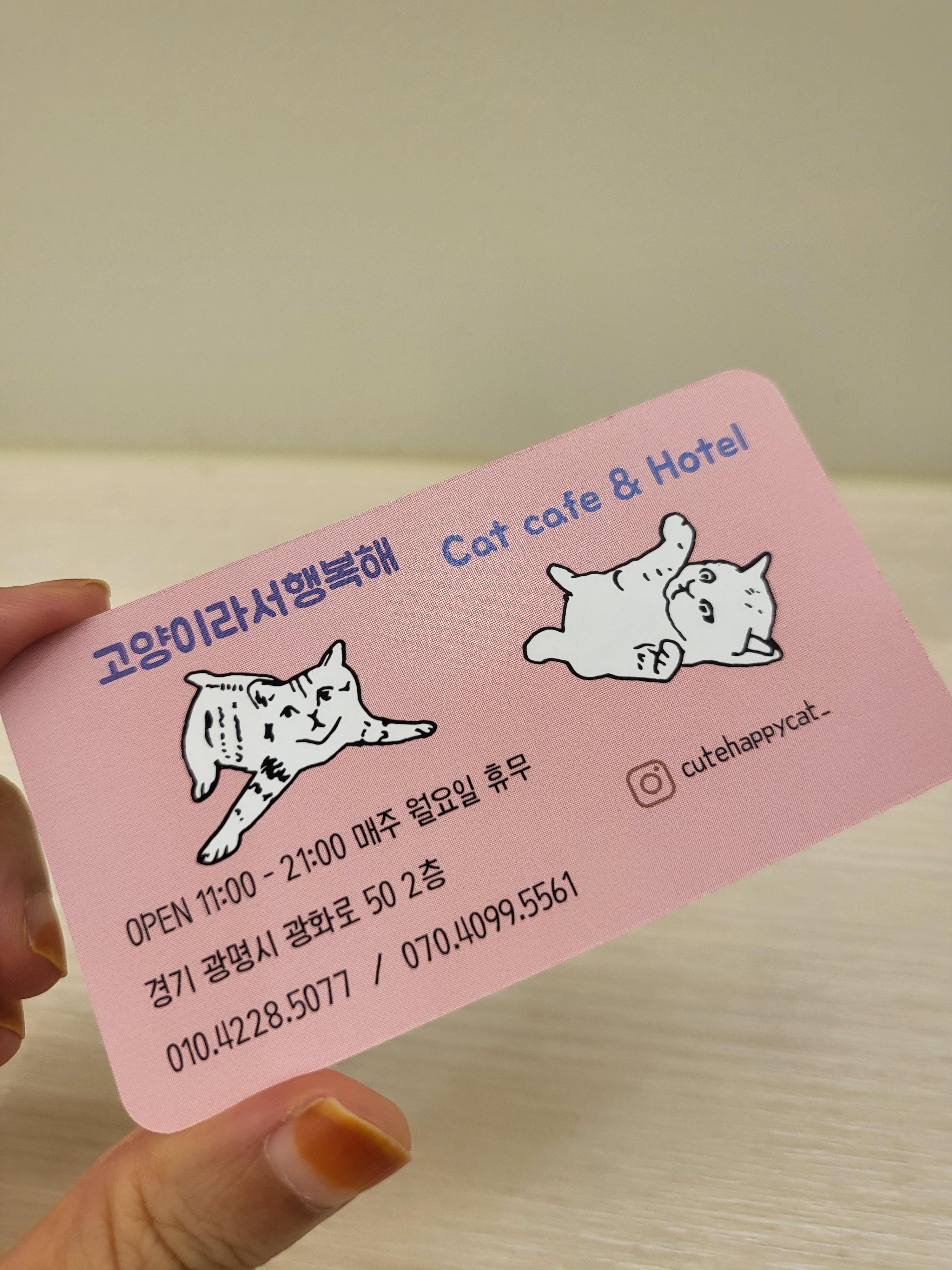 어제는 비도오고 하원 후 마땅히 할 것도 없어서 평소 아이가 가고 싶다고 했었던 고양이카페를 다녀 왔습니다. 저희 동네에서 가장 가까운 곳을 찾아보니 거기는 만 5세 미만은 입장 불가라고 씌여 있더라고요. 그래서 다른 곳을 찾다가 그나마 20분 거리인 광명의 '고양이라서행복해' 라는 고양이카페를 찾았어요.
