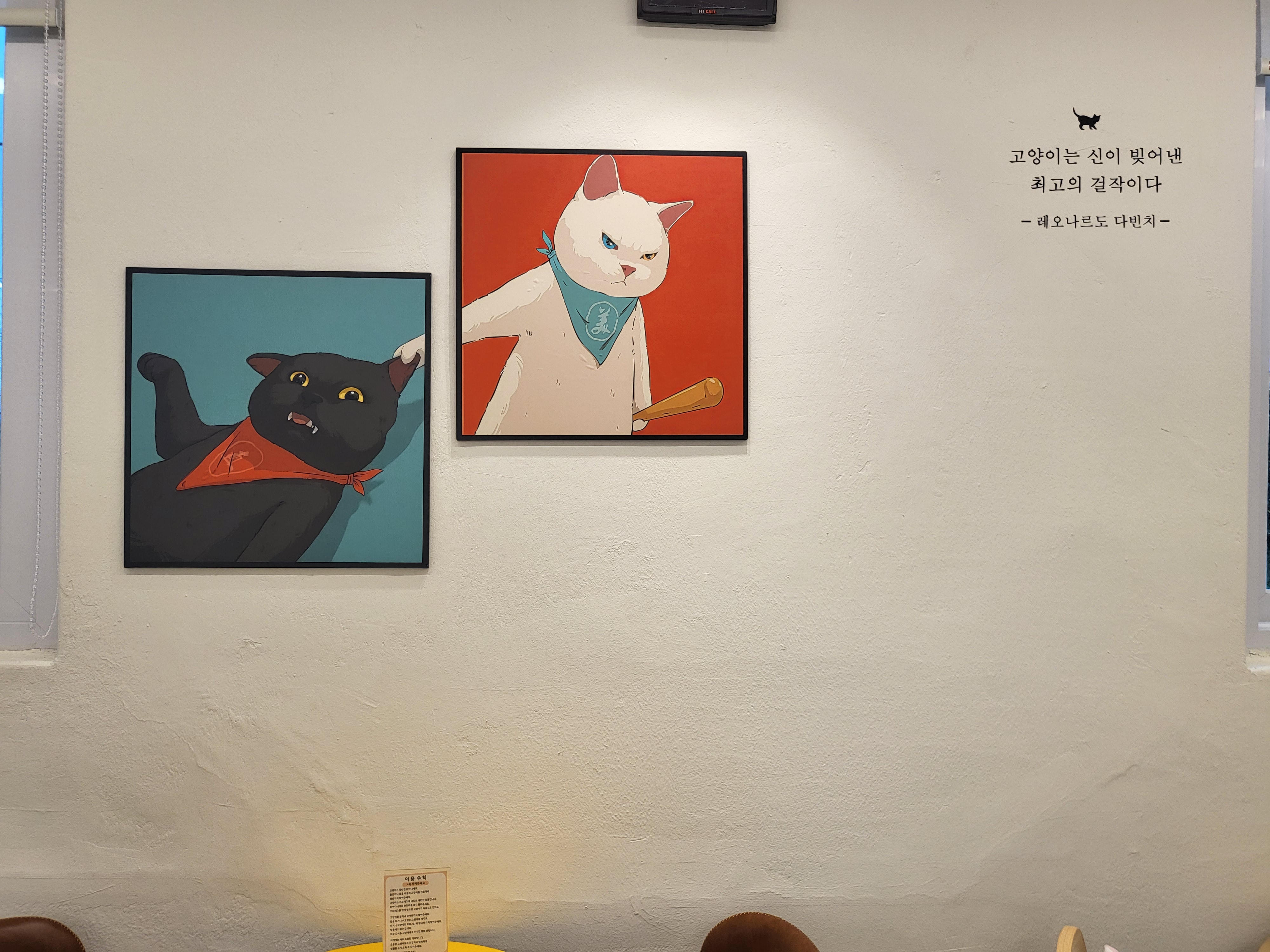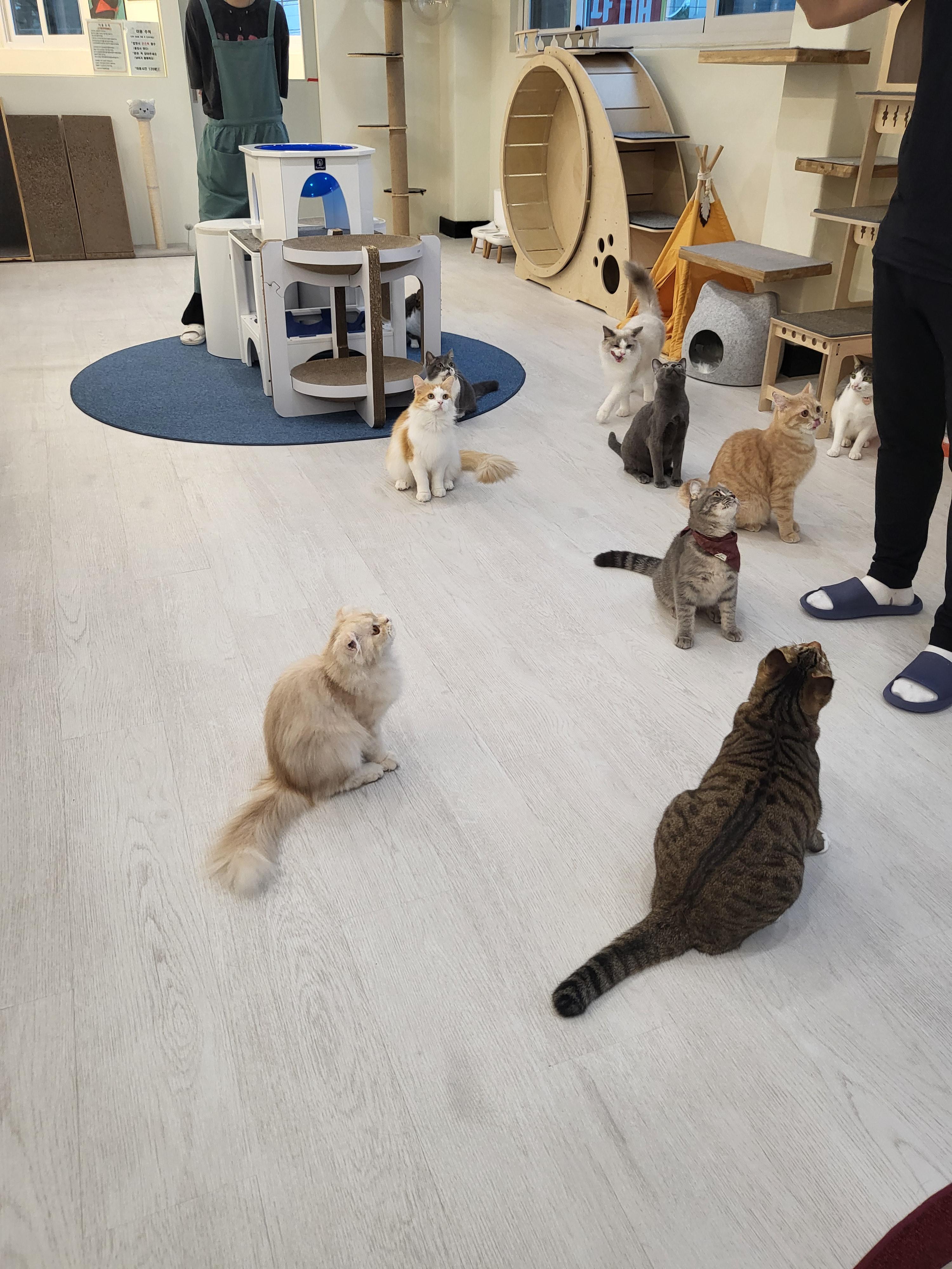주의사항 같은 것이 곳곳에 적혀 있어요. 사장님께서 고양이들을 최우선시 하는 마음이 느껴졌습니다. 거의 다 파향되거나 버려진 아이들을 데려오신거래요. 너무나 멋지십니다. 제각각 다 아픔이 있는 고양이들인데도 그래도 잘 케어해주신 덕분인지 건강해 보였습니다.
