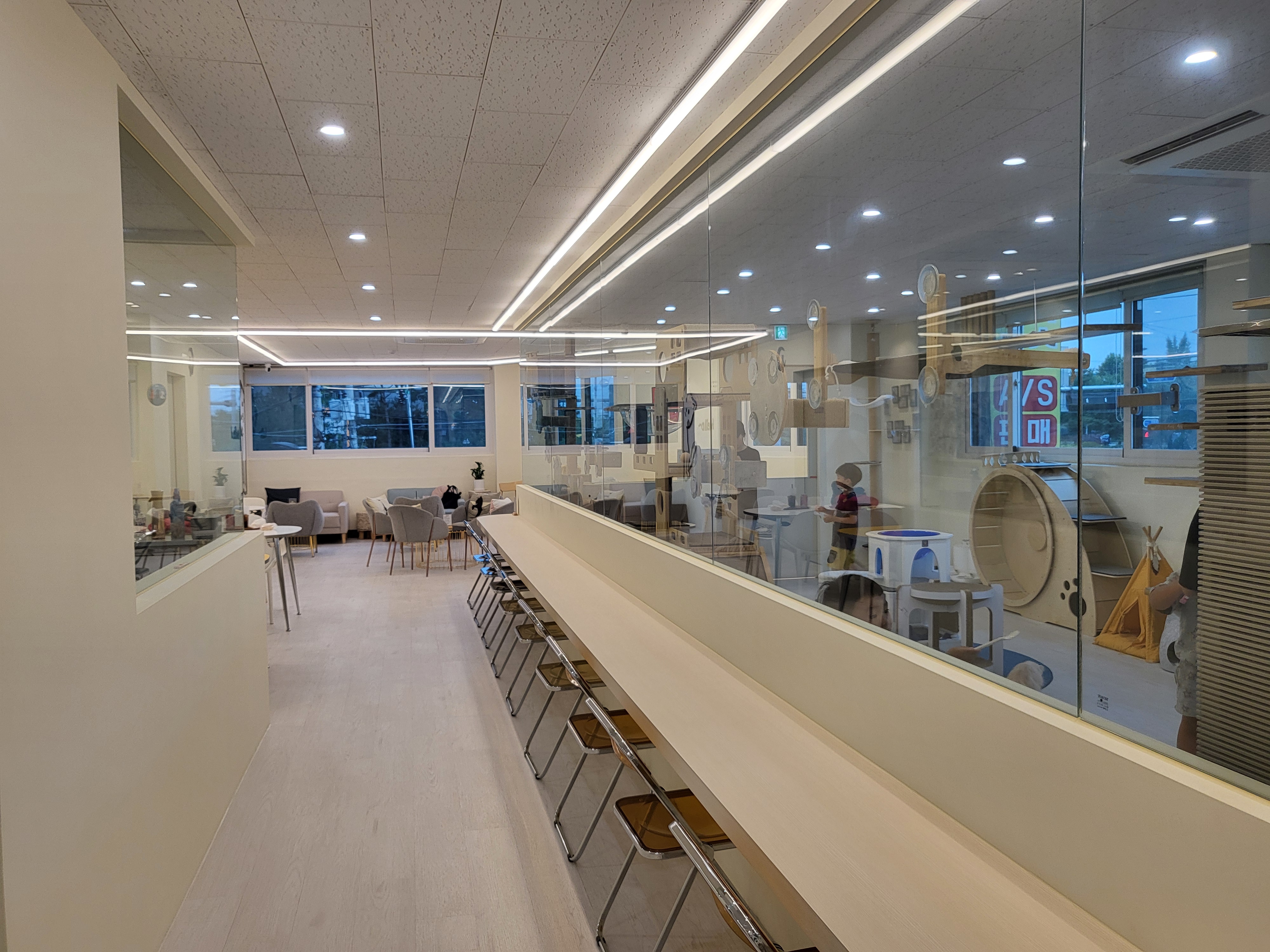 입장하면 낡은 건물에 비해 인테리어 리모델링이 참 깨끗하고 잘되어있다는 것을 느꼈고요. 냄새도 안나더라고요. 고양이들이 모여있는 곳과 차를 마시는 곳이 분리되어 있어서 더 쾌적하게 느껴졌던 것 같아요. 평일 늦은 오후라 그런지 자리도 많고 한산해서 좋았어요.