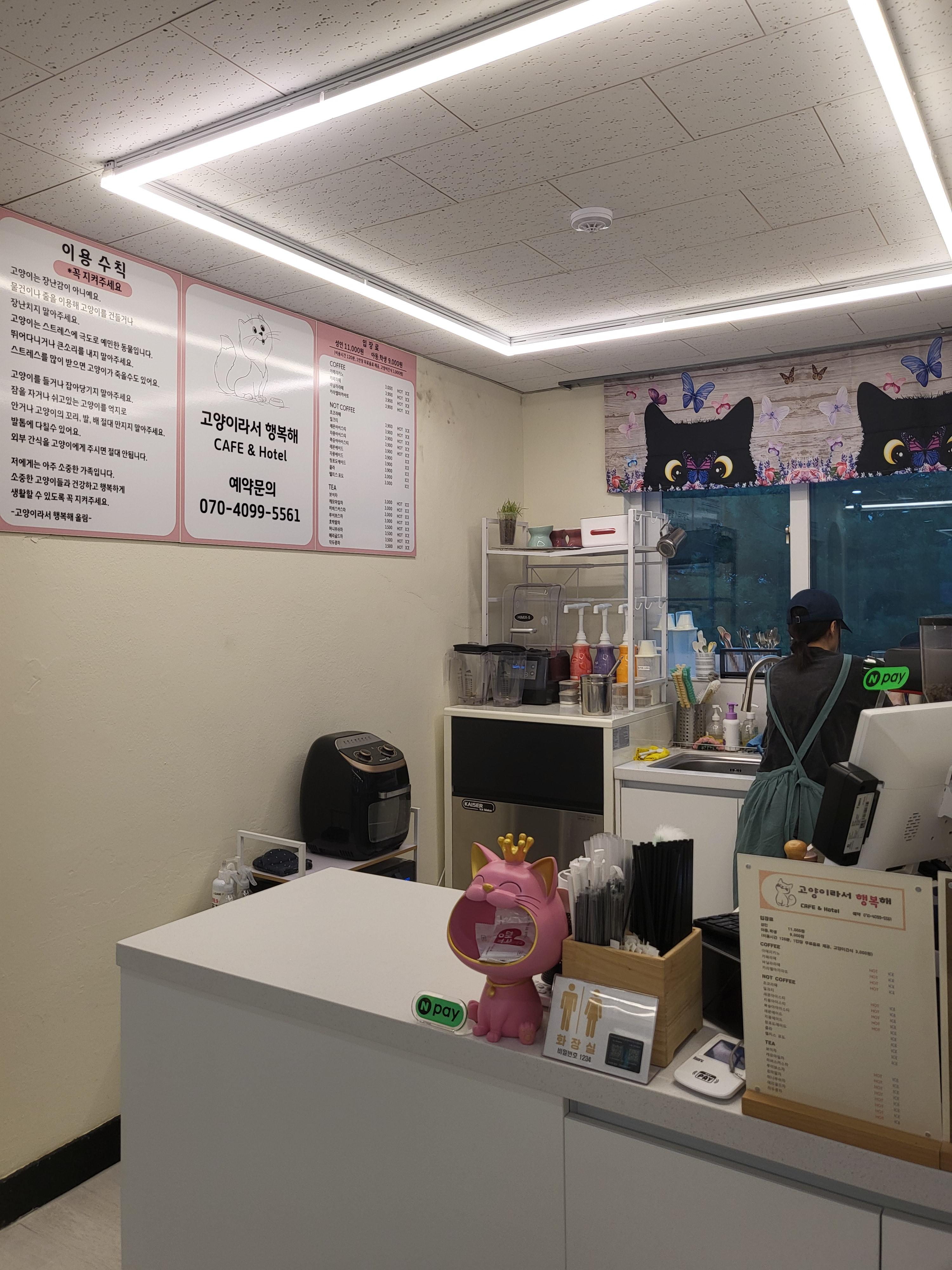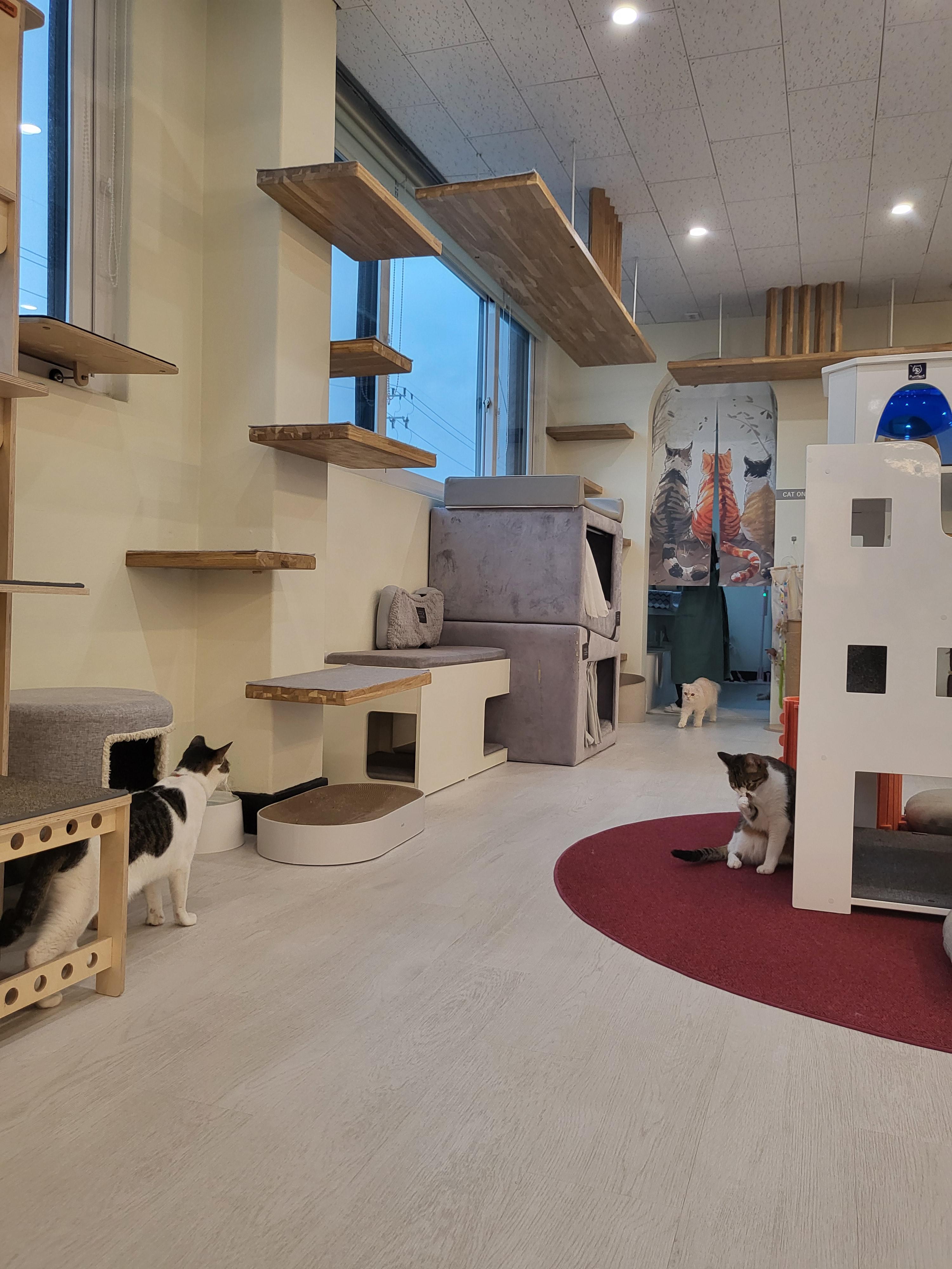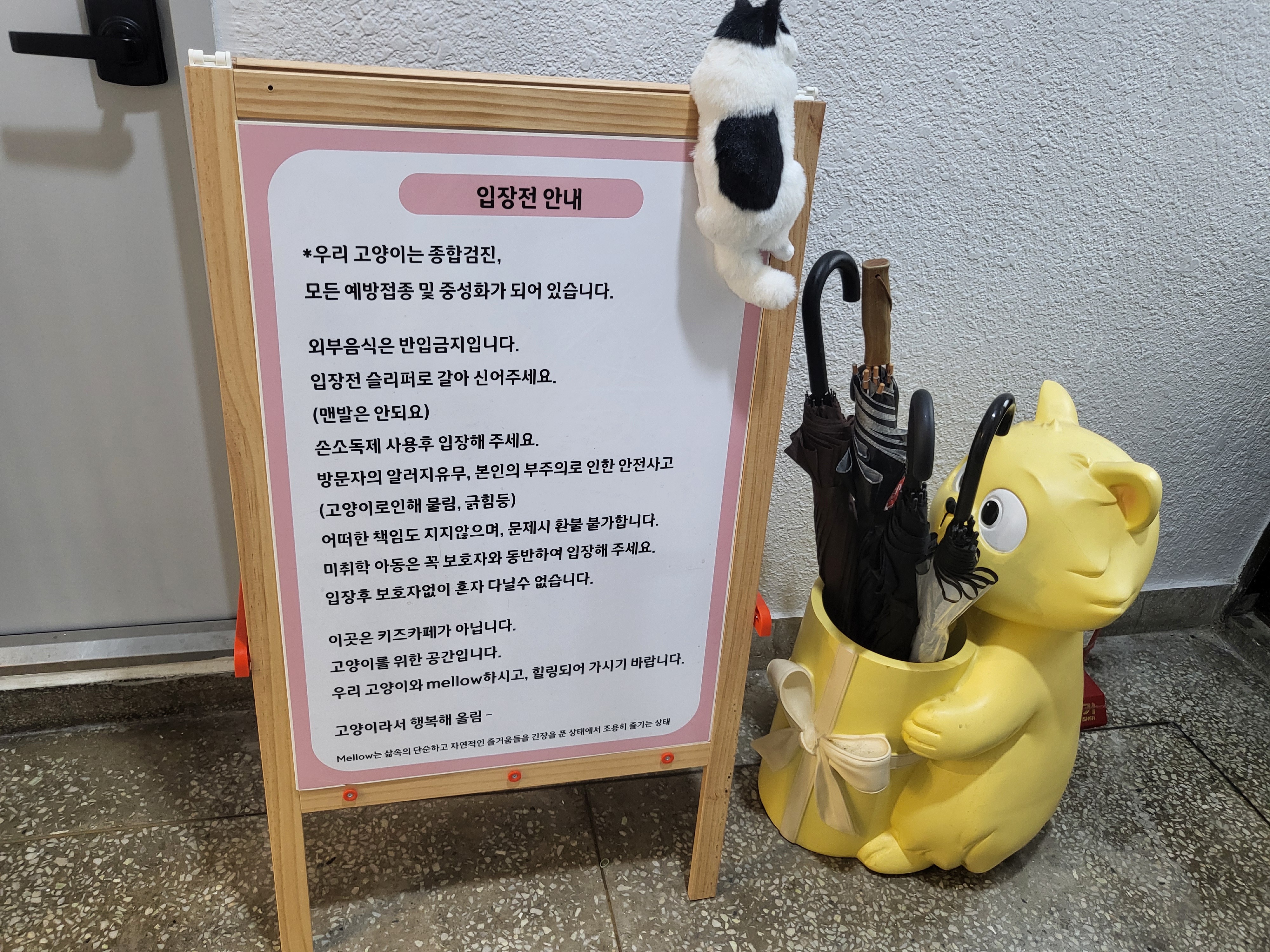 주의사항 같은 것이 곳곳에 적혀 있어요. 사장님께서 고양이들을 최우선시 하는 마음이 느껴졌습니다. 거의 다 파향되거나 버려진 아이들을 데려오신거래요. 너무나 멋지십니다. 제각각 다 아픔이 있는 고양이들인데도 그래도 잘 케어해주신 덕분인지 건강해 보였습니다.