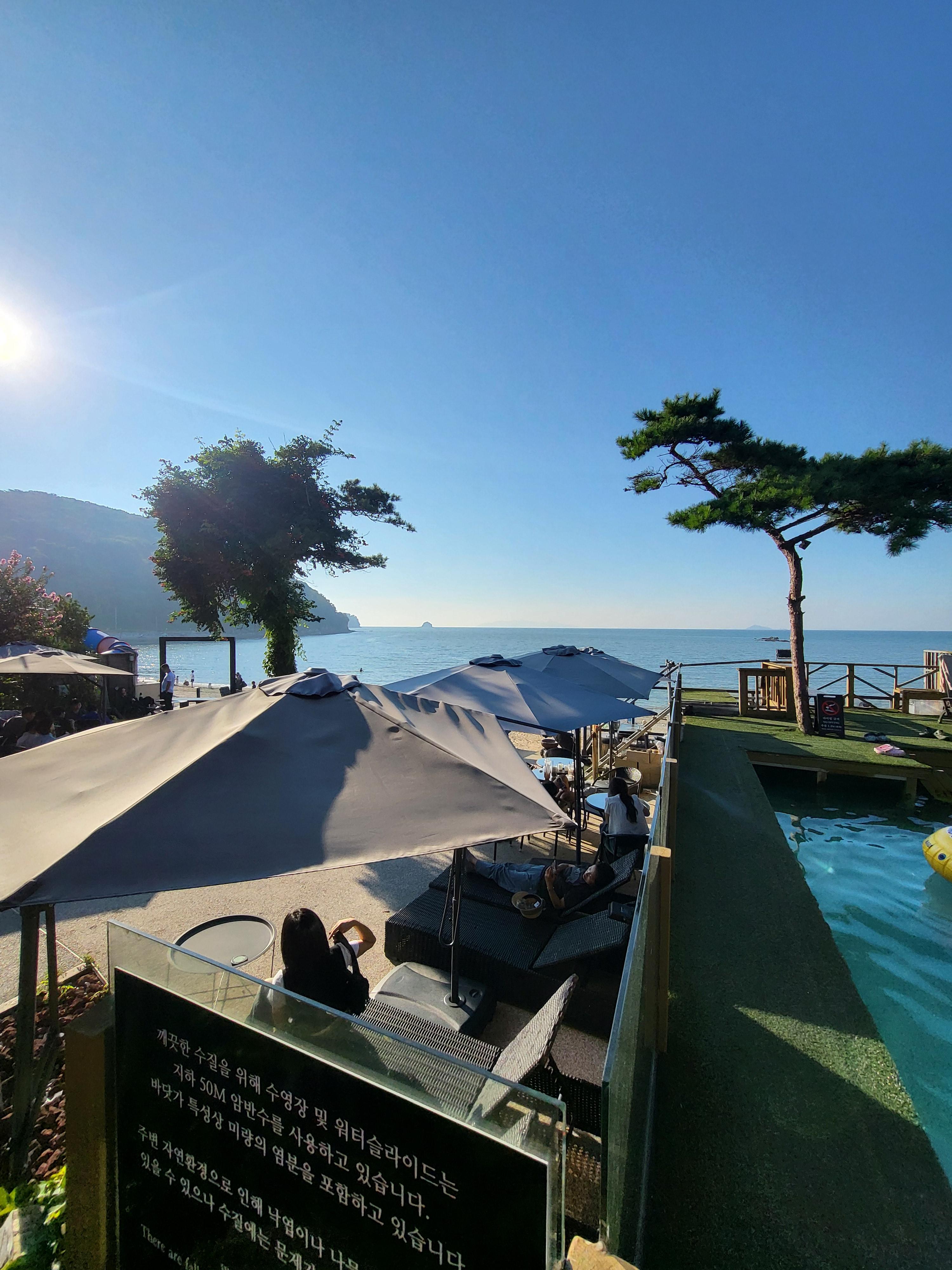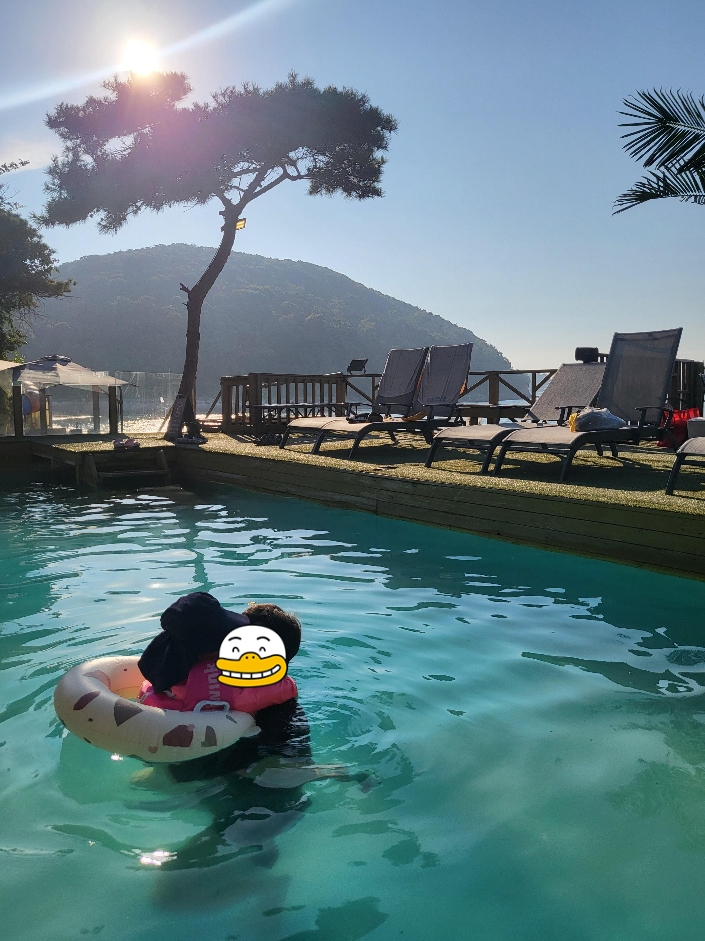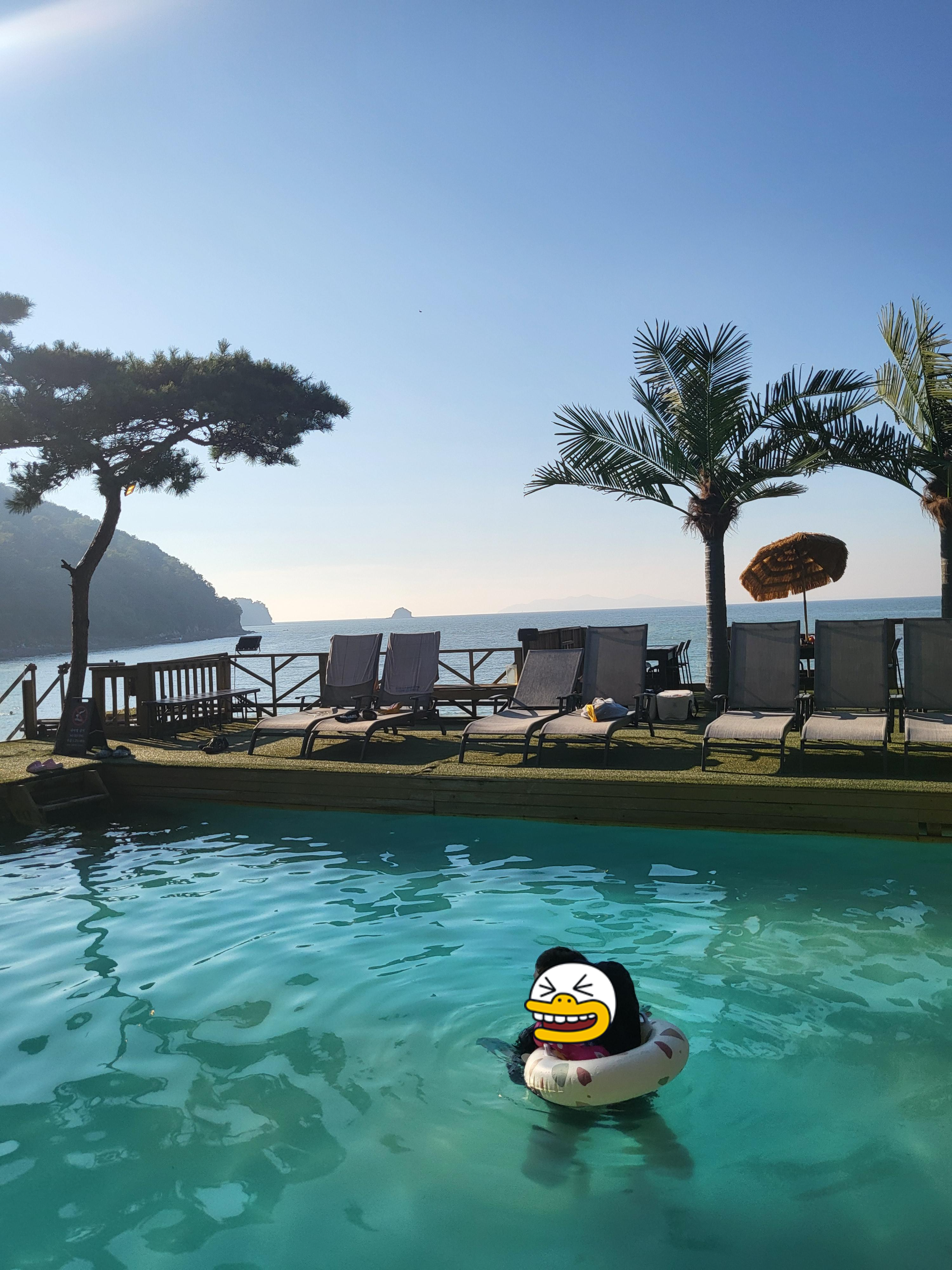 급하게 예약해서 온 거기도 하고 그래도 수영장에서 올해 마지막 수영이나 재밌게 하고 오자라고 마인드컨트롤을 하고 얼른 옷갈아 입혀서 수영하러 나갔어요. 수영장은 뷰가 참 좋아요. 어떻게 찍어도 너무 이쁘게 잘나오더라고요. 꽤 긴 슬라이딩 미끄럼틀도 있었지만 아이는 아직 어려서 못탔고 수영장에서만 재밌게 놀다 왔습니다. 수영장에서 놀다가 지겨우면 바닷가 구경도 한 번 하고 오고 나름 알찼어요.