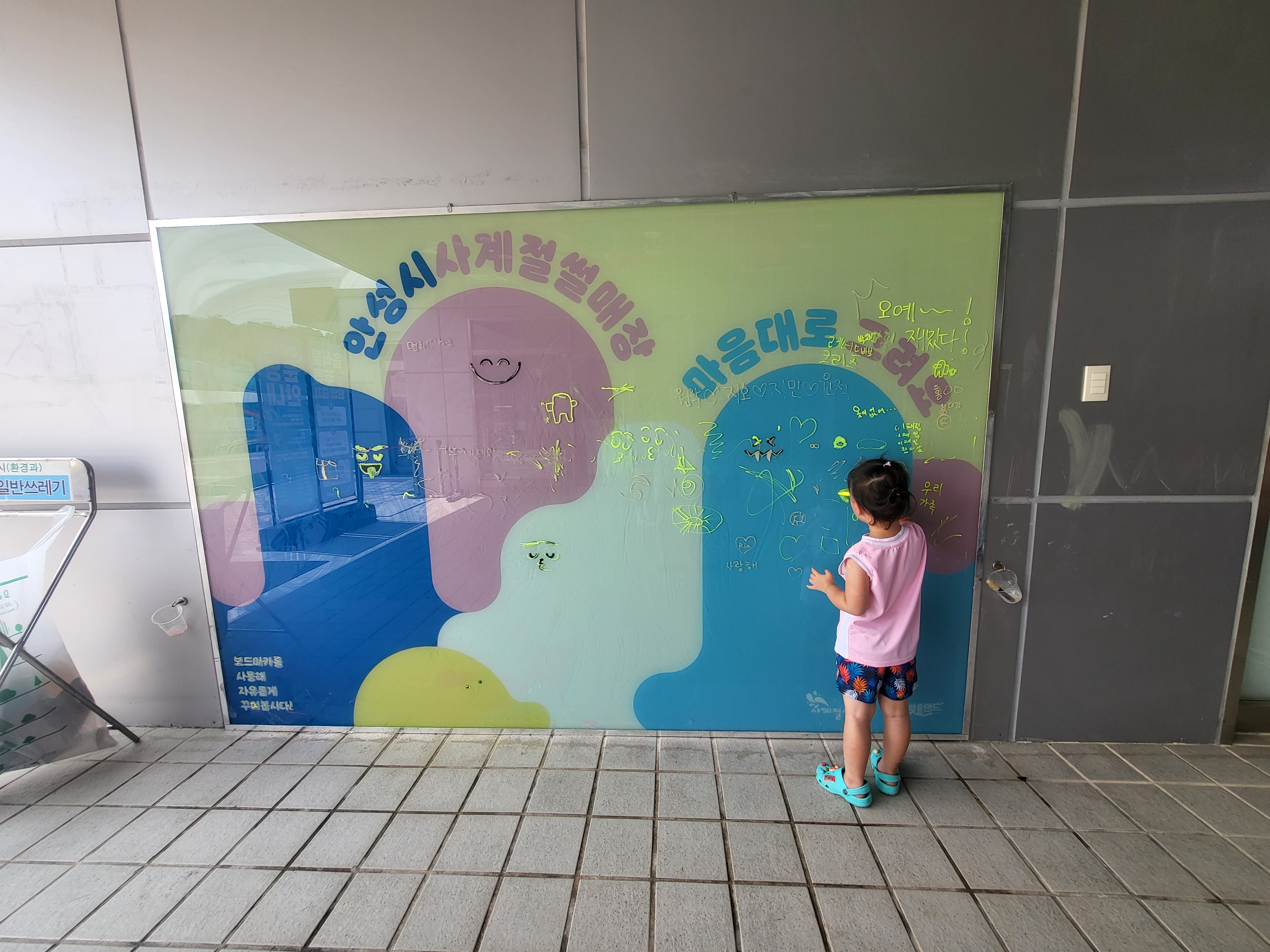 점심시간에 잘 못 맞춰가서 뭐하고 시간 떼우나 했는데 다행히 입구 앞에 이런 보드마카로 놀이할 수 있는 곳이 있더라고요. 그래서 좀 덥긴 했지만 나름 낙서 하고 그림 그리며 시간을 보낼 수 있었습니다.
