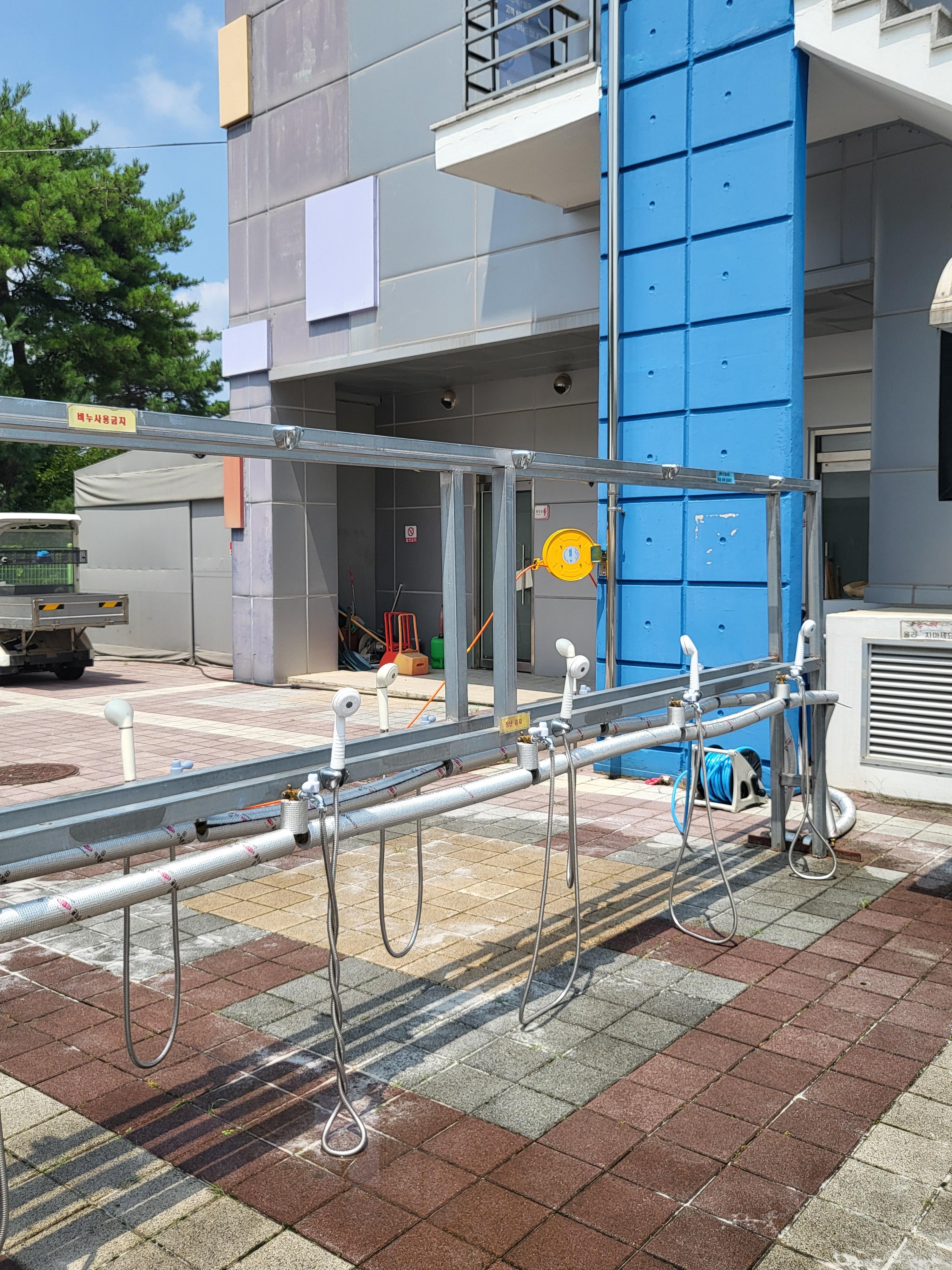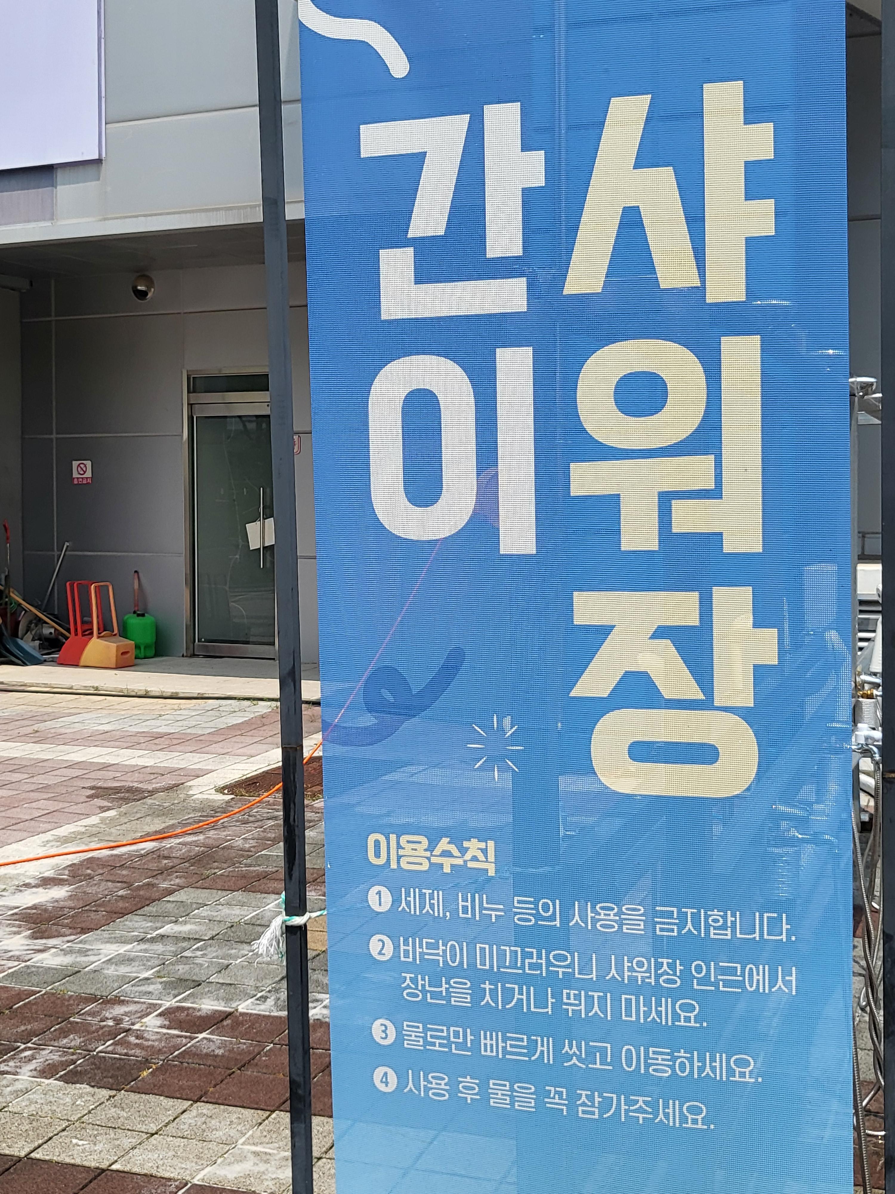 샤워장이라기보다는 간단히 물로만 빠르게 씻어내는 정도에요. 여기서 비누, 샴푸 등은 사용 불가입니다. 저도 집에서 가자마자 바로 씻기려고 수영복 입은채로 얼른 샤워기로 대충 뿌려줬어요. 물은 찬물밖에 안나옵니다.