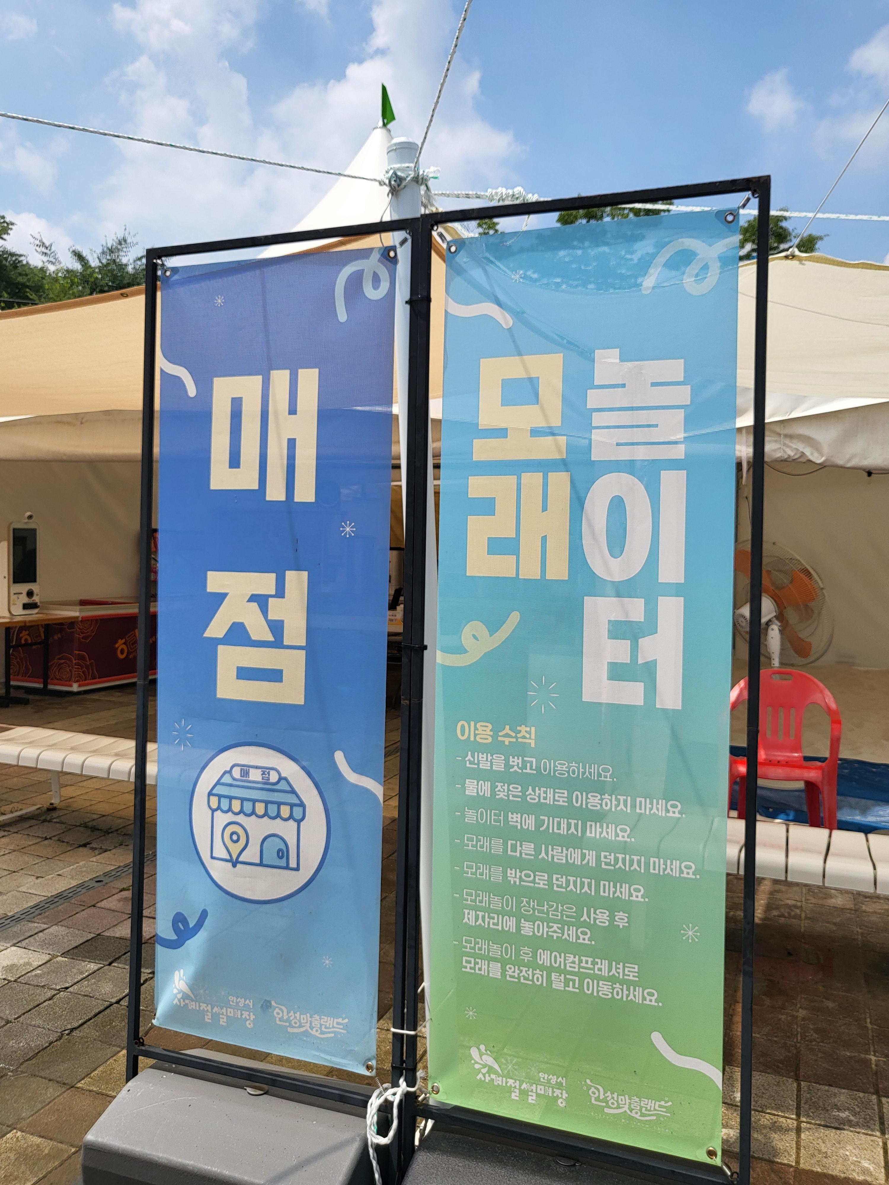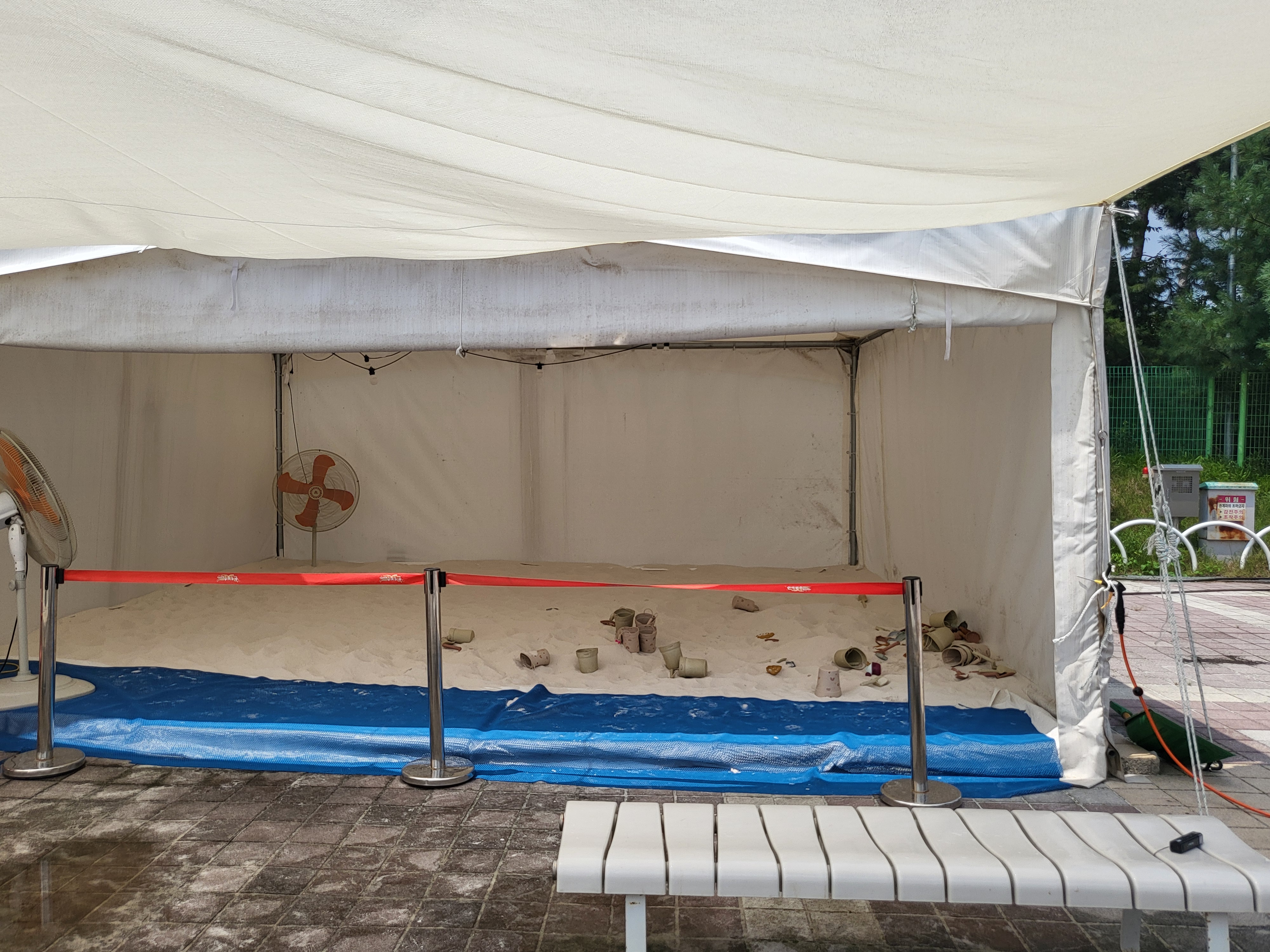 모래놀이터도 있어요. 너무 더워서 그런지 인기가 생각보다 없더라고요. 모래놀이를 한 뒤로는 바로 물놀이터 입장은 안되고 옆에 있는 에어컴프레셔로 모래를 털고 들어가야 합니다. 그리고 모래놀이터 바로 옆에 간이 샤워장도 있어요.