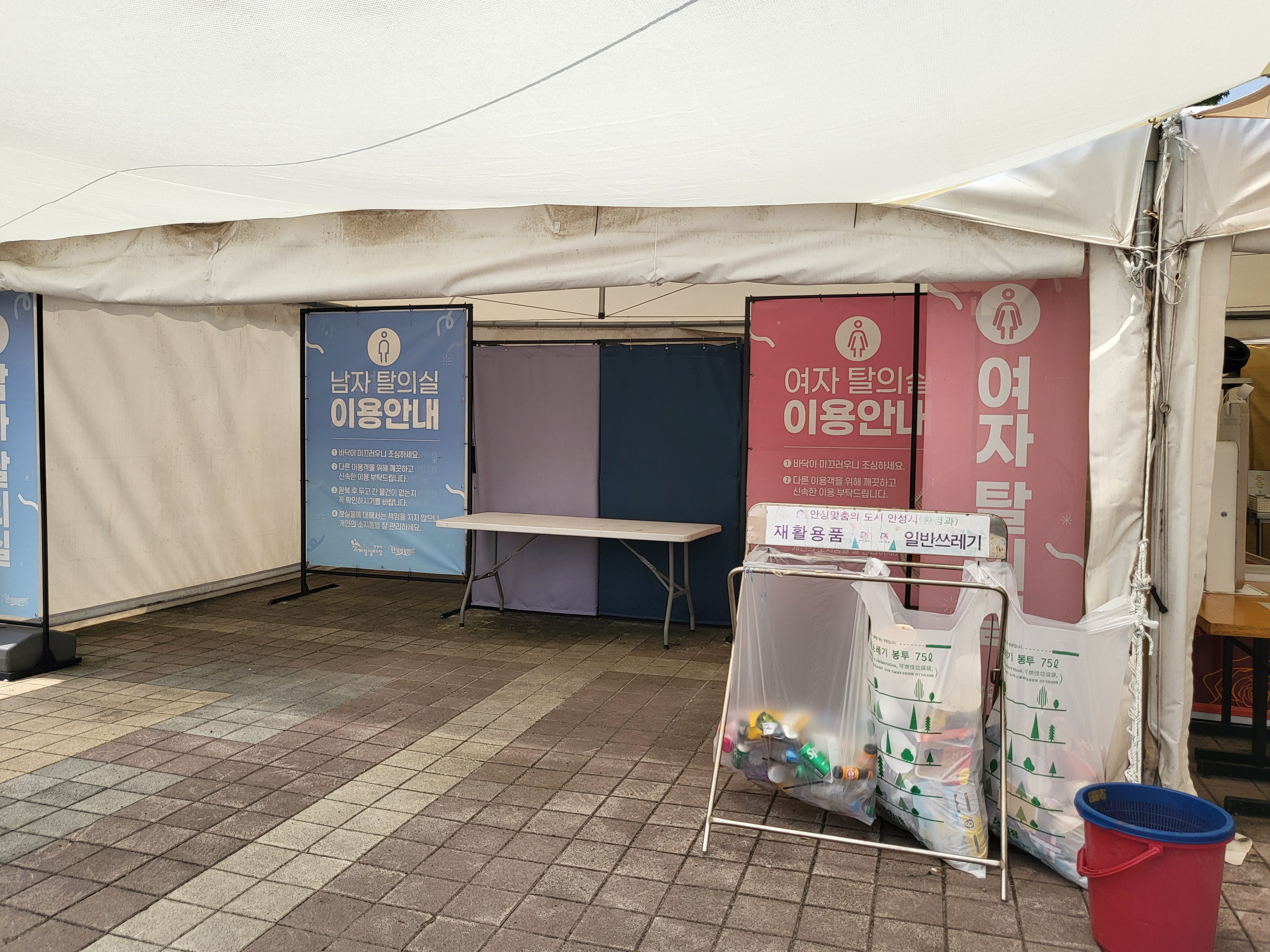 이렇게 간이 탈의실이 있긴 했지만 들어가보진 않았어요. 저 뿐 아니라 그렇게 많이 이용은 안하는 것 같더라고요. 보통 수영복을 많이 이미 입고 오기도 하고 워낙 날이 더워서 곰세 말라서 그런것 같기도 해요.