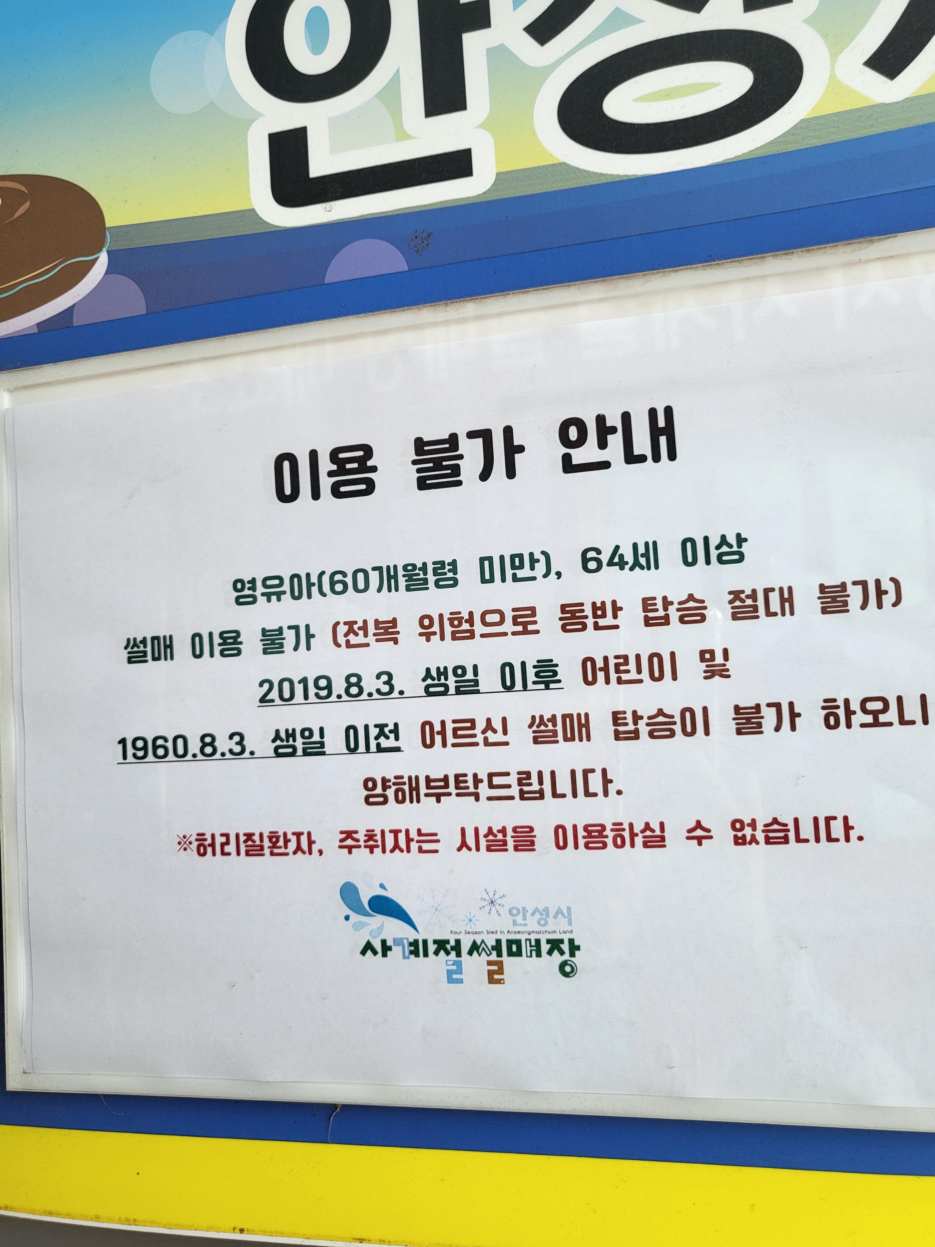 저희 아이는 아직 60개월이 안되어서 썰매장 이용은 못하였습니다. 그리고 64세 이상도 이용 불가에요. 그런데 제가 간 날은 너무 폭염이라 어차피 썰매를 끌고 올라갔다 내려왔다 할 자신도 없더라고요. 너무 더워서 그런지 생각보다 썰매이용하는 사람은 적었어요.