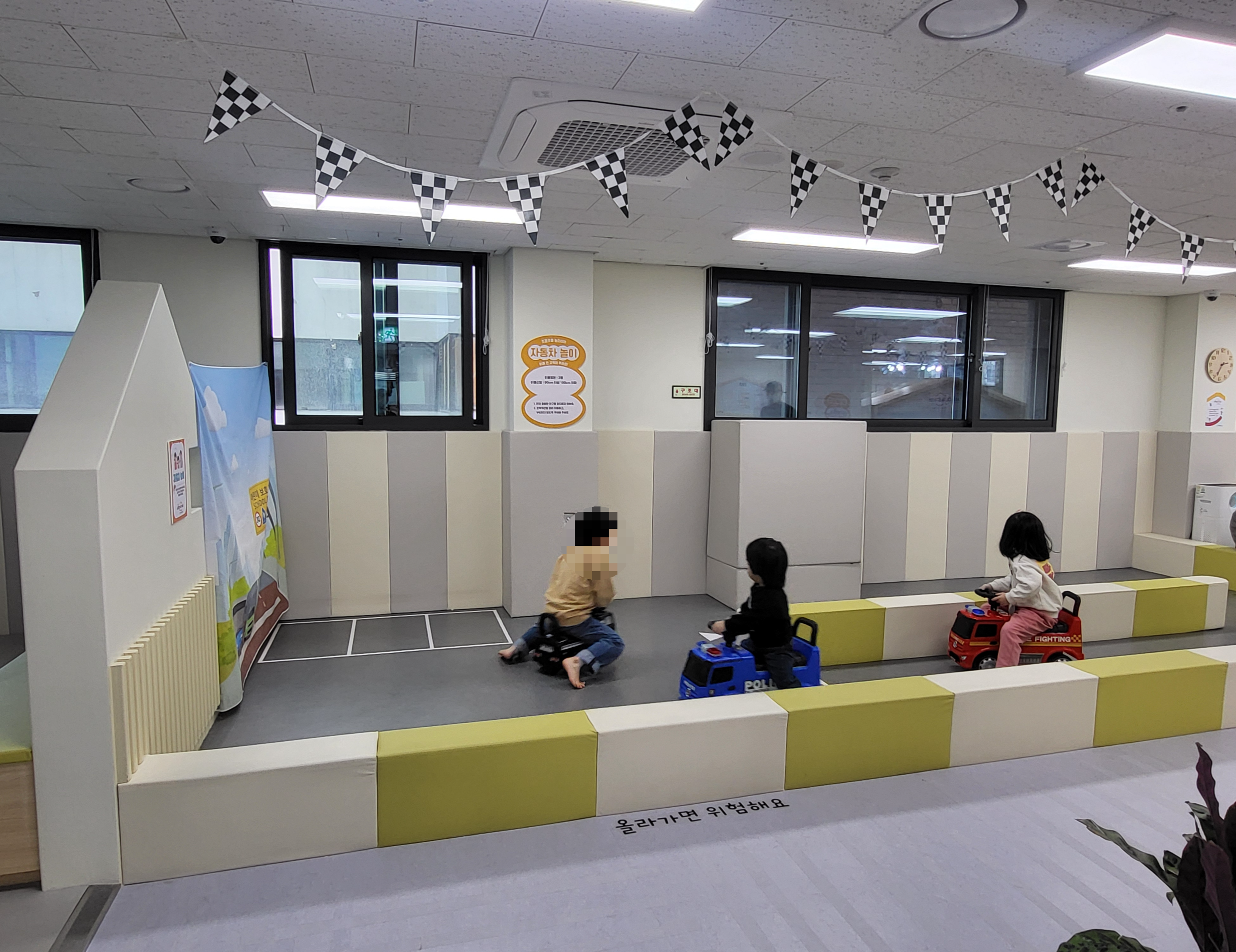 저희 아이도 한참 땀흘리며 왔다갔다 놀다가 복도 건너 새로운 공간에서는 자동차를 한참 탔어요.