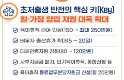 중소기업의 경우, 정부가 최초 5일은 배우자 출산휴가 급여를 지원하고 나머지 5일은 기업에서 부담하고 있습니다. 정부는 내년부터 중소기업에 지원하는 배우자 출산휴가 급여도 5일에서 20일 전체로 확대하기로 했습니다. 이에 따라 제도적으로는 있지만 눈치보여서 10일을 다 쓰지 못했던 배우자 출산휴가도 마음편히 쓸 수 있을 것 같습니다.