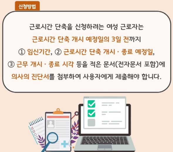 -근로시간 단축을 원하는 여성 근로자는 근로시간 단축 개시 예정일의 3일 전까지 임신기간, 근로시간 단축 개시 예정일 및 종료 예정일, 근무 개시 시각 및 종료 시각 등을 적은 문서와 의사의 진단서(임신일수가 기재된)를 첨부하여 회사에 제출해야 합니다. 단, 같은 임신에 대한 재신청의 경우는 의사진단서는 추가적으로 필요하지 않습니다.