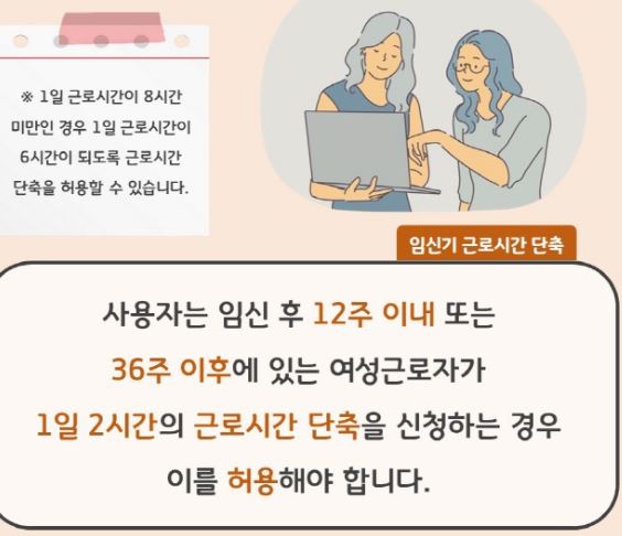 -회사는 임신 후 12주 이내 또는 36주 이후(현행기준)에 있는 여성근로자가 1일 2시간의 근로시간 단축을 신청하는 경우 이를 허용해야 합니다